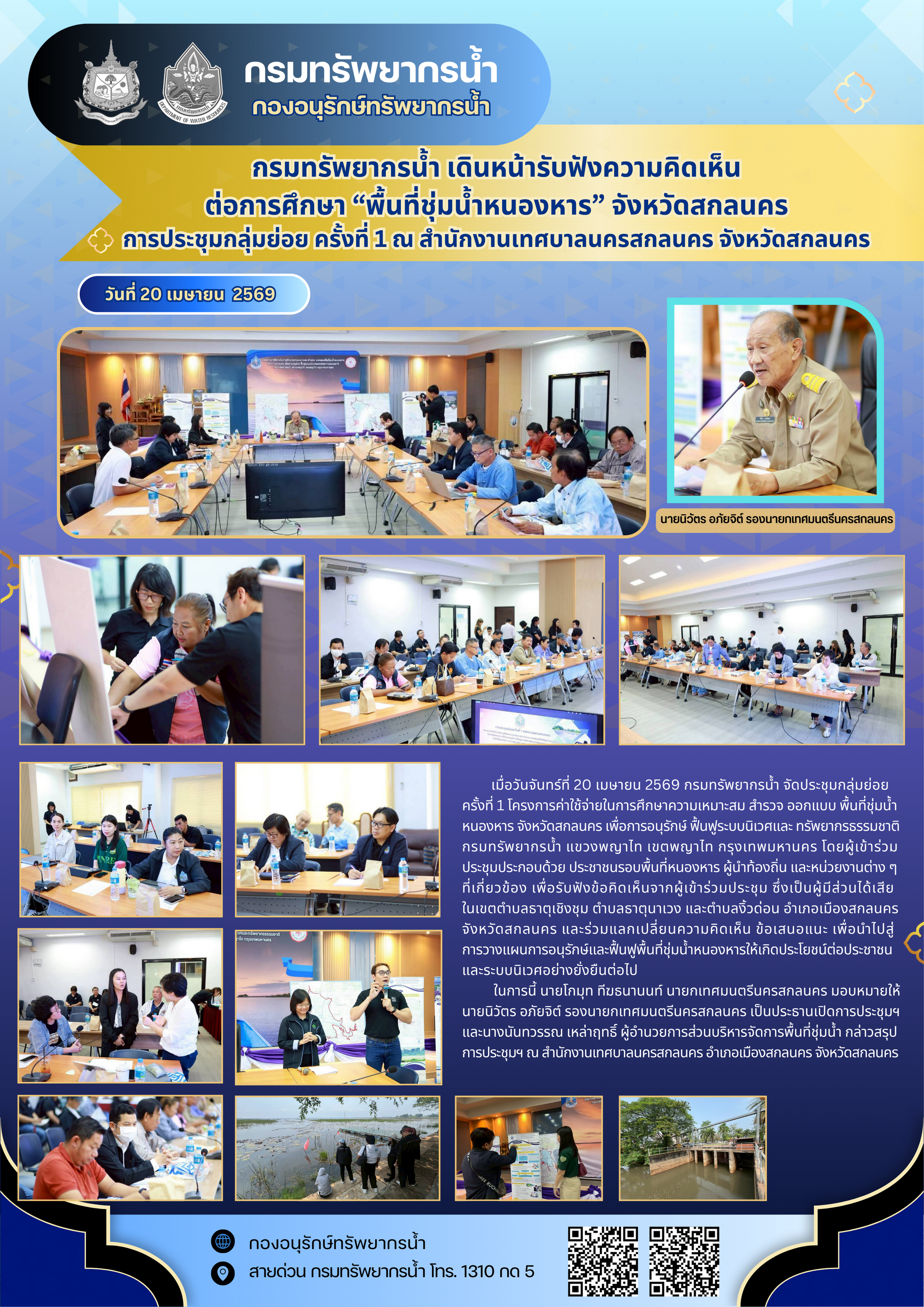 เมื่อวันจันทร์ที่ 20 เมษายน 2569 กรมทรัพยากรน้ำ จัดประชุมกลุ่มย่อยครั้งที่ 1 โครงการค่าใช้จ่ายในการศึกษาความเหมาะสม สำรวจ ออกแบบ พื้นที่ชุ่มน้ำหนองหาร จังหวัดสกลนคร เพื่อการอนุรักษ์ ฟื้นฟูระบบนิเวศและ ทรัพยากรธรรมชาติ กรมทรัพยากรน้ำ แขวงพญาไท เขตพญาไท กรุงเทพมหานคร โดยผู้เข้าร่วมประชุมประกอบด้วย ประชาชนรอบพื้นที่หนองหาร ผู้นำท้องถิ่น และหน่วยงานต่าง ๆ ที่เกี่ยวข้อง เพื่อรับฟังข้อคิดเห็นจากผู้เข้าร่วมประชุม ซึ่งเป็นผู้มีส่วนได้เสีย ในเขตตำบลธาตุเชิงชุม ตำบลธาตุนาเวง และตำบลงิ้วด่อน อำเภอเมืองสกลนคร จังหวัดสกลนคร และร่วมแลกเปลี่ยนความคิดเห็น ข้อเสนอแนะ เพื่อนำไปสู่การวางแผนการอนุรักษ์และฟื้นฟูพื้นที่ชุ่มน้ำหนองหารให้เกิดประโยชน์ต่อประชาชน และระบบนิเวศอย่างยั่งยืนต่อไป ในการนี้ นายโกมุท ทีฆธนานนท์ นายกเทศมนตรีนครสกลนคร มอบหมายให้ นายนิวัตร อภัยจิต์ รองนายกเทศมนตรีนครสกลนคร เป็นประธานเปิดการประชุมฯ และนางนันทวรรณ เหล่าฤทธิ์ ผู้อำนวยการส่วนบริหารจัดการพื้นที่ชุ่มน้ำ กล่าวสรุปการประชุมฯ ณ สำนักงานเทศบาลนครสกลนคร อำเภอเมืองสกลนคร จังหวัดสกลนคร
