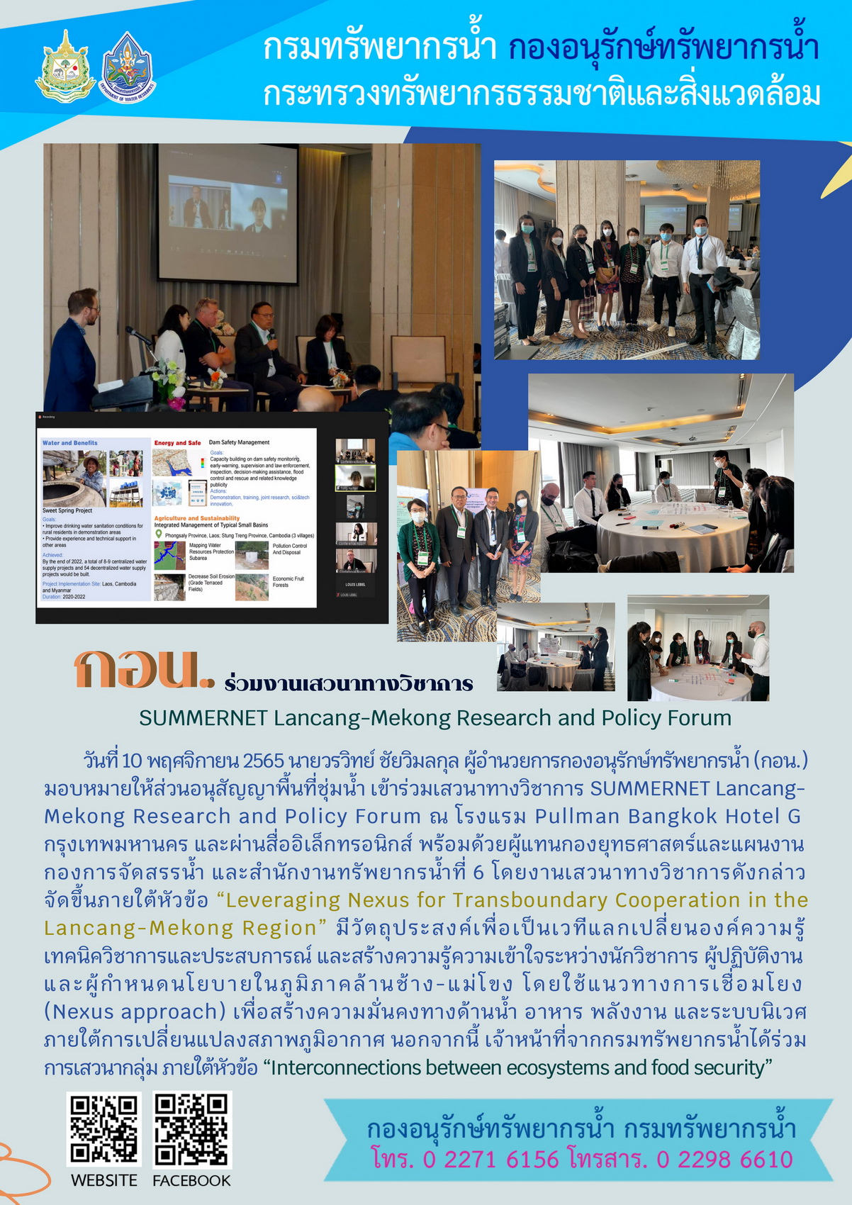 วันที่ 10 พฤศจิกายน 2565 นายวรวิทย์ ชัยวิมลกุล ผู้อำนวยการกองอนุรักษ์ทรัพยากรน้ำ (กอน.) มอบหมายให้ส่วนอนุสัญญาพื้นที่ชุ่มน้ำ เข้าร่วมเสวนาทางวิชาการ SUMMERNET Lancang-Mekong Research and Policy Forum ณ โรงแรม Pullman Bangkok Hotel G กรุงเทพมหานคร และผ่านสื่ออิเล็กทรอนิกส์ พร้อมด้วยผู้แทนกองยุทธศาสตร์และแผนงาน กองการจัดสรรน้ำ และสำนักงานทรัพยากรน้ำที่ 6