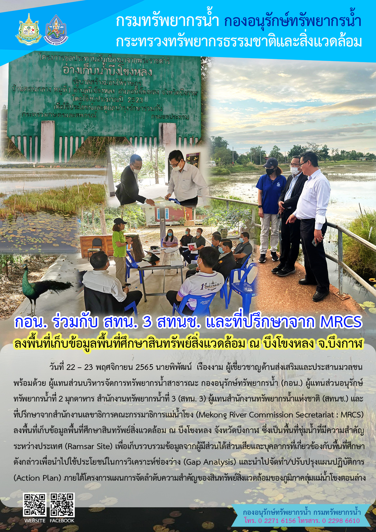 วันที่ 22 – 23 พฤศจิกายน 2565 นายพิพัฒน์ เรืองงาม ผู้เชี่ยวชาญด้านส่งเสริมและประสานมวลชน พร้อมด้วย ผู้แทนส่วนบริหารจัดการทรัพยากรน้ำสาธารณะ กองอนุรักษ์ทรัพยากรน้ำ (กอน.) ผู้แทนส่วนอนุรักษ์ทรัพยากรน้ำที่ 2 มุกดาหาร สำนักงานทรัพยากรน้ำที่ 3 (สทน. 3) ผู้แทนสำนักงานทรัพยากรน้ำแห่งชาติ (สทนช.) และที่ปรึกษาจากสำนักงานเลขาธิการคณะกรรมาธิการแม่น้ำโขง (Mekong River Commission Secretariat : MRCS) ลงพื้นที่เก็บข้อมูลพื้นที่ศึกษาสินทรัพย์สิ่งแวดล้อม ณ บึงโขงหลง จังหวัดบึงกาฬ