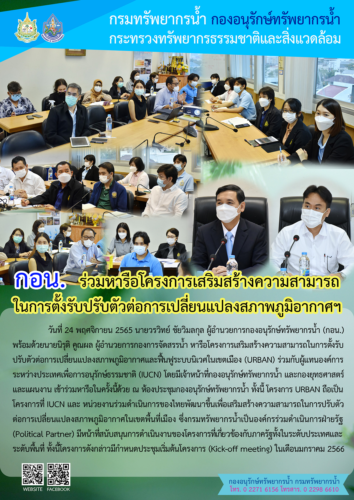 วันที่ 24 พฤศจิกายน 2565 นายวรวิทย์ ชัยวิมลกุล ผู้อำนวยการกองอนุรักษ์ทรัพยากรน้ำ (กอน.) พร้อมด้วยนายนิรุติ คูณผล ผู้อำนวยการกองการจัดสรรน้ำ หารือโครงการเสริมสร้างความสามารถในการตั้งรับปรับตัวต่อการเปลี่ยนแปลงสภาพภูมิอากาศและฟื้นฟูระบบนิเวศในเขตเมือง (URBAN) ร่วมกับผู้แทนองค์การระหว่างประเทศเพื่อการอนุรักษ์ธรรมชาติ (IUCN) โดยมีเจ้าหน้าที่กองอนุรักษ์ทรัพยากรน้ำ และกองยุทธศาสตร์และแผนงาน เข้าร่วมหารือในครั้งนี้ด้วย ณ ห้องประชุมกองอนุรักษ์ทรัพยากรน้ำ