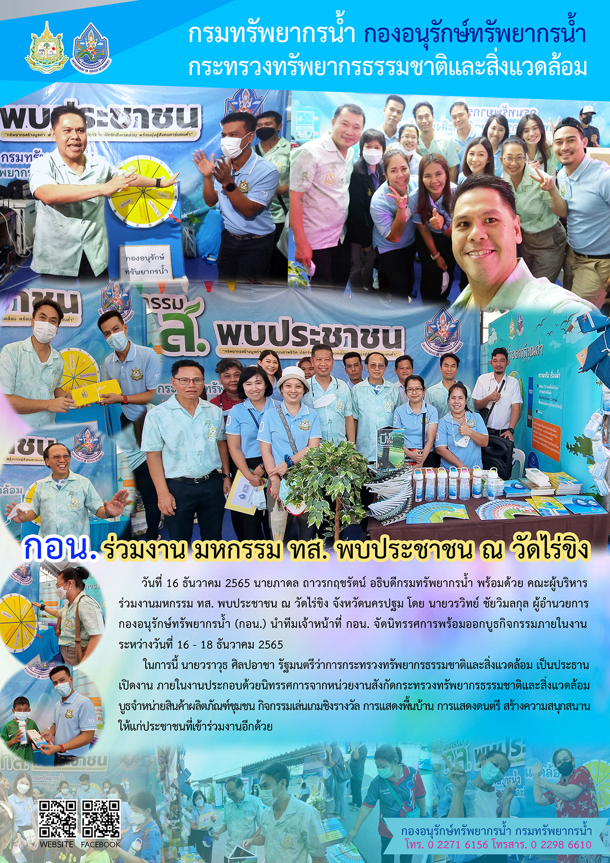 วันที่ 16 ธันวาคม 2565 นายภาดล ถาวรกฤชรัตน์ อธิบดีกรมทรัพยากรน้ำ พร้อมด้วย คณะผู้บริหารกรมทรัพยากรน้ำ ร่วมงานมหกรรม ทส. พบประชาชน ณ วัดไร่ขิง จังหวัดนครปฐม โดย นายวรวิทย์ ชัยวิมลกุล ผู้อำนวยการกองอนุรักษ์ทรัพยากรน้ำ (กอน.) นำทีมเจ้าหน้าที่ กอน. จัดนิทรรศการพร้อมออกบูธกิจกรรมภายในงานระหว่างวันที่ 16 – 18 ธันวาคม 2565