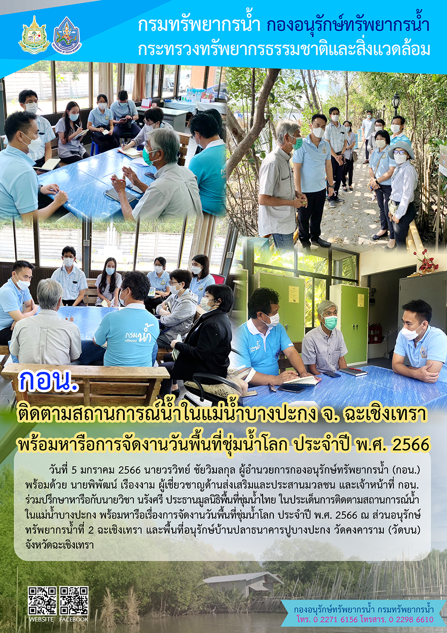 วันที่ 5 มกราคม 2566 กอน. ติดตามสถานการณ์น้ำในแม่น้ำบางปะกง จ. ฉะเชิงเทรา พร้อมหารือการจัดงานวันพื้นที่ชุ่มน้ำโลก ประจำปี พ.ศ. 2566