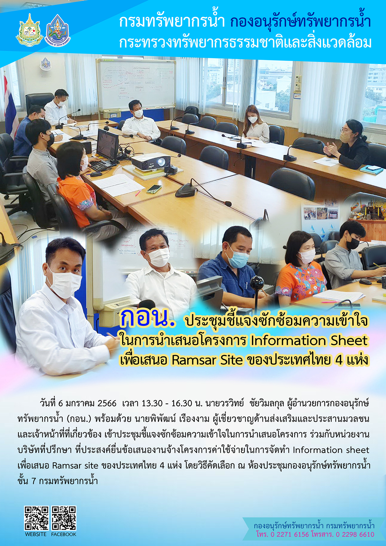 วันที่ 6 มกราคม 2566 กอน. ประชุมชี้แจงซักซ้อมความเข้าใจในการนำเสนอโครงการ Information Sheet เพื่อเสนอ Ramsar Site ของประเทศไทย 4 แห่ง