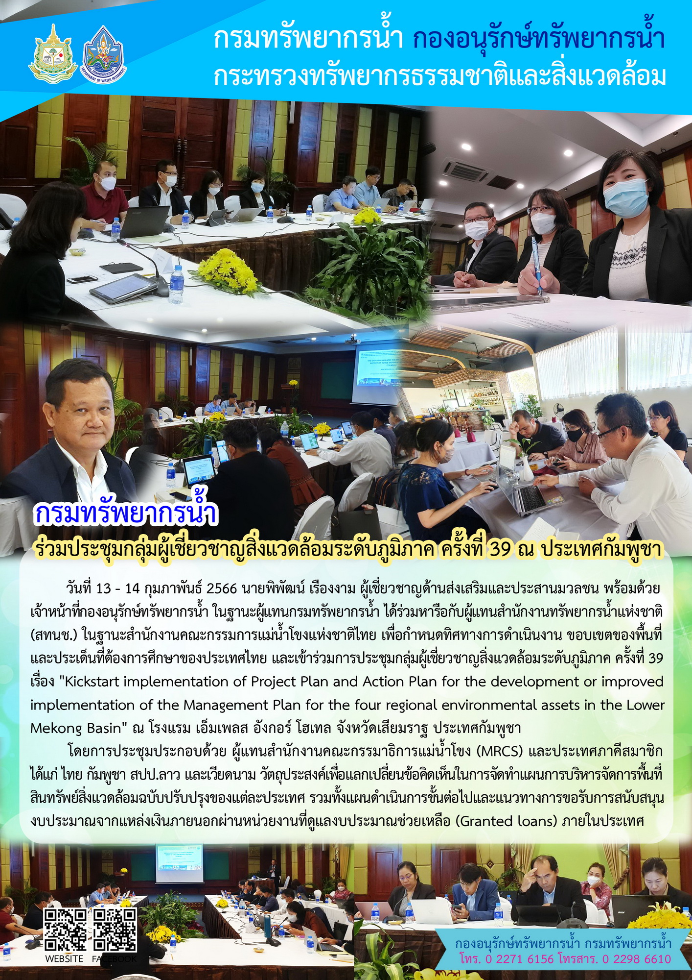 วันที่ 13 - 14 กุมภาพันธ์ 2566 นายพิพัฒน์ เรืองงาม ผู้เชี่ยวชาญด้านส่งเสริมและประสานมวลชน พร้อมด้วยเจ้าหน้าที่ที่ กองอนุรักษ์ทรัพยากรน้ำ ในฐานะผู้แทนกรมทรัพยากรน้ำ ได้ร่วมหารือกับผู้แทนสำนักงานทรัพยากรน้ำแห่งชาติ (สทนช.) ในฐานะสำนักงานคณะกรรมการแม่น้ำโขงแห่งชาติไทย เพื่อกำหนดทิศทางการดำเนินงาน ขอบเขตของพื้นที่และประเด็นที่ต้องการศึกษาของประเทศไทย และเข้าร่วมการประชุมกลุ่มผู้เชี่ยวชาญสิ่งแวดล้อมระดับภูมิภาค ครั้งที่ 39 เรื่อง "Kickstart implementation of Project Plan and Action Plan for the development or improved implementation of the Management Plan for the four regional environmental assets in the Lower Mekong Basin" ณ โรงแรม เอ็มเพลส อังกอร์ โฮเทล จังหวัดเสียมราฐ ประเทศกัมพูชา