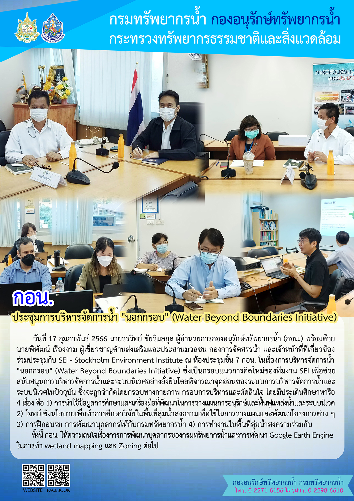 วันที่ 17 กุมภาพันธ์ 2566 นายวรวิทย์ ชัยวิมลกุล ผู้อำนวยการกองอนุรักษ์ทรัพยากรน้ำ (กอน.) พร้อมด้วย นายพิพัฒน์ เรืองงาม ผู้เชี่ยวชาญด้านส่งเสริมและประสานมวลชน กองการจัดสรรน้ำ และเจ้าหน้าที่ที่เกี่ยวข้อง ร่วมประชุมกับ SEI - Stockholm Environment Institute ณ ห้องประชุมชั้น 7 กอน. ในเรื่องการบริหารจัดการน้ำ "นอกกรอบ" (Water Beyond Boundaries Initiative)