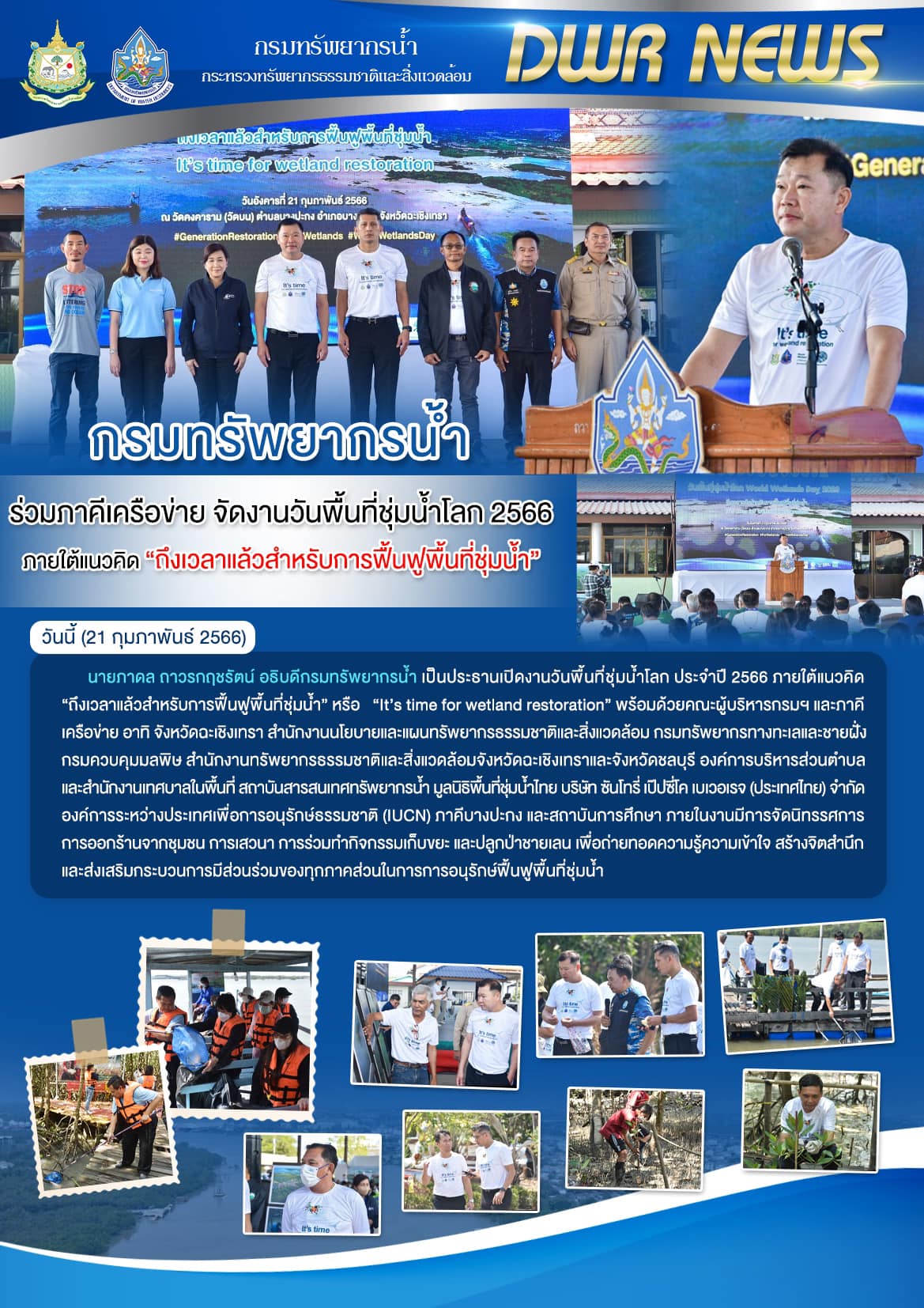 (21 กุมภาพันธ์ 2566) นายภาดล ถาวรกฤชรัตน์ อธิบดีกรมทรัพยากรน้ำ เป็นประธานเปิดงานวันพื้นที่ชุ่มน้ำโลก ประจำปี 2566 ภายใต้แนวคิด “ถึงเวลาแล้วสำหรับการฟื้นฟูพื้นที่ชุ่มน้ำ” หรือ “It’s time for wetland restoration”
